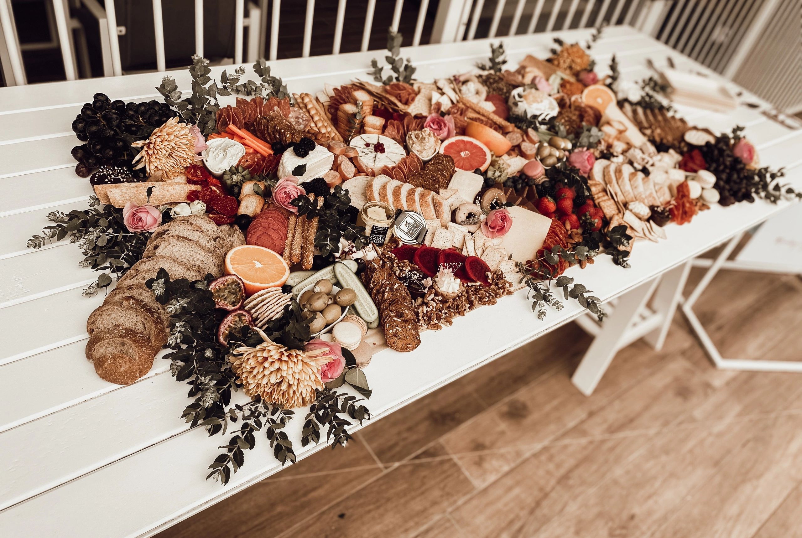 Our flat-lay grazing platters are a beautifully styled and more affordable alternative to full grazing tables, perfect for any event. Designed as a single-layer display directly on the table, these platters are thoughtfully styled with fresh foliage and seasonal florals for a natural, elegant look.